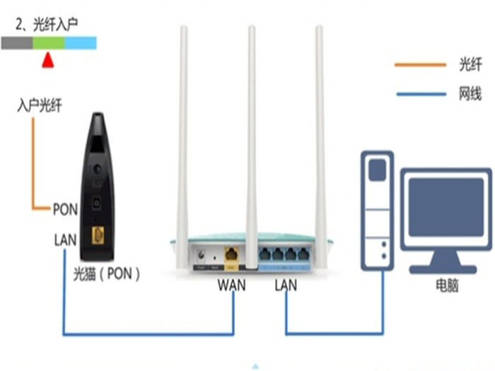 2、光纤上网:用户需要准备2根网线,一根网线用来连接光猫与路由器的WAN接口,另一根网线用来连接计算机与路由器的LAN接口(1/2/3/4中的任意一个都可以)。连接方式和电话线的一样,请参考上面的图片进行连接。